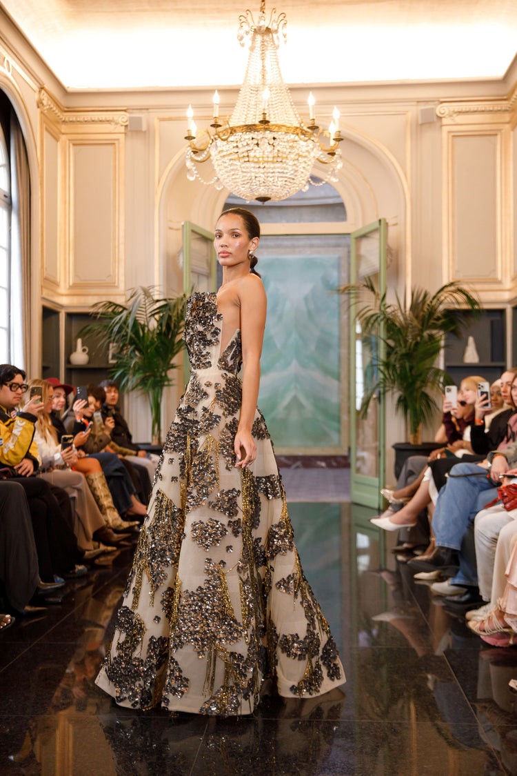 This breathtaking gown in off white and black is a true couture masterpiece, crafted from sheer tulle adorned with handmade beaded floral embroidery and intricate metallic gold threads. The design features a long golden chain fringe, adding movement and radiance with every step. This piece perfectly blends sophistication with craftsmanship—ideal for grand soirées and red-carpet appearances.