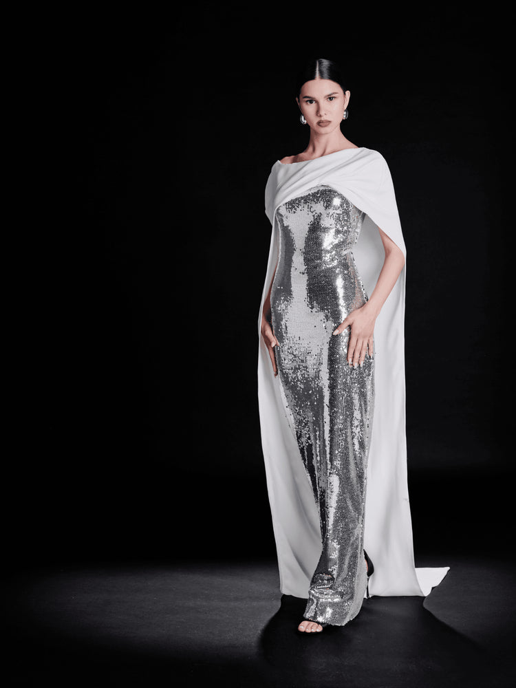Make a statement with this breathtaking White & Silver Sequin Gown, designed for those who embrace elegance and glamour. Featuring a draped white bodice that seamlessly transitions into a shimmering silver sequin skirt, this gown creates a striking contrast that radiates sophistication. The asymmetrical design and fluid silhouette enhance its modern appeal, making it the perfect choice for special occasions, evening events, or red-carpet moments.