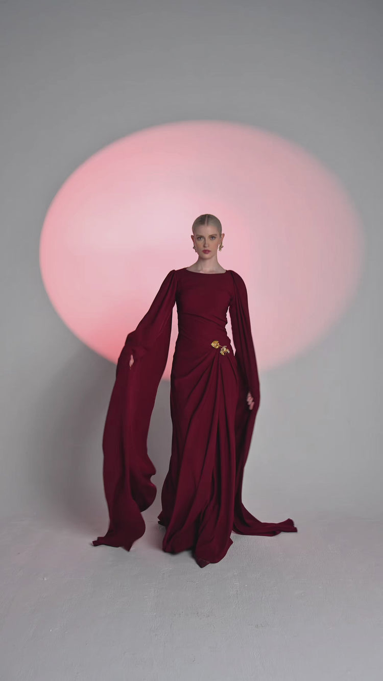 Elevate your evening look with this deep red gown, designed to exude effortless glamour and regal sophistication. The elegantly draped bodice features a sculpted fit that enhances the waist, cinched with a golden floral embellishment for a touch of opulence. The true highlight of this gown is the dramatic flowing sleeves, creating a sense of movement and grandeur with every step. The structured boat neckline adds a timeless elegance, making this dress a standout piece for any formal occasion.