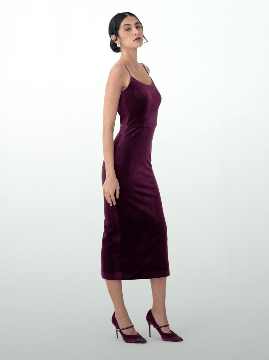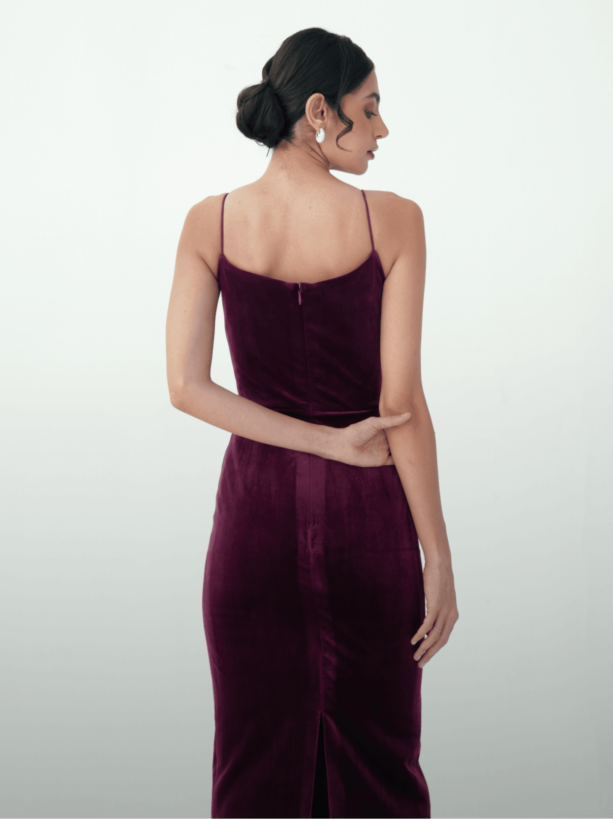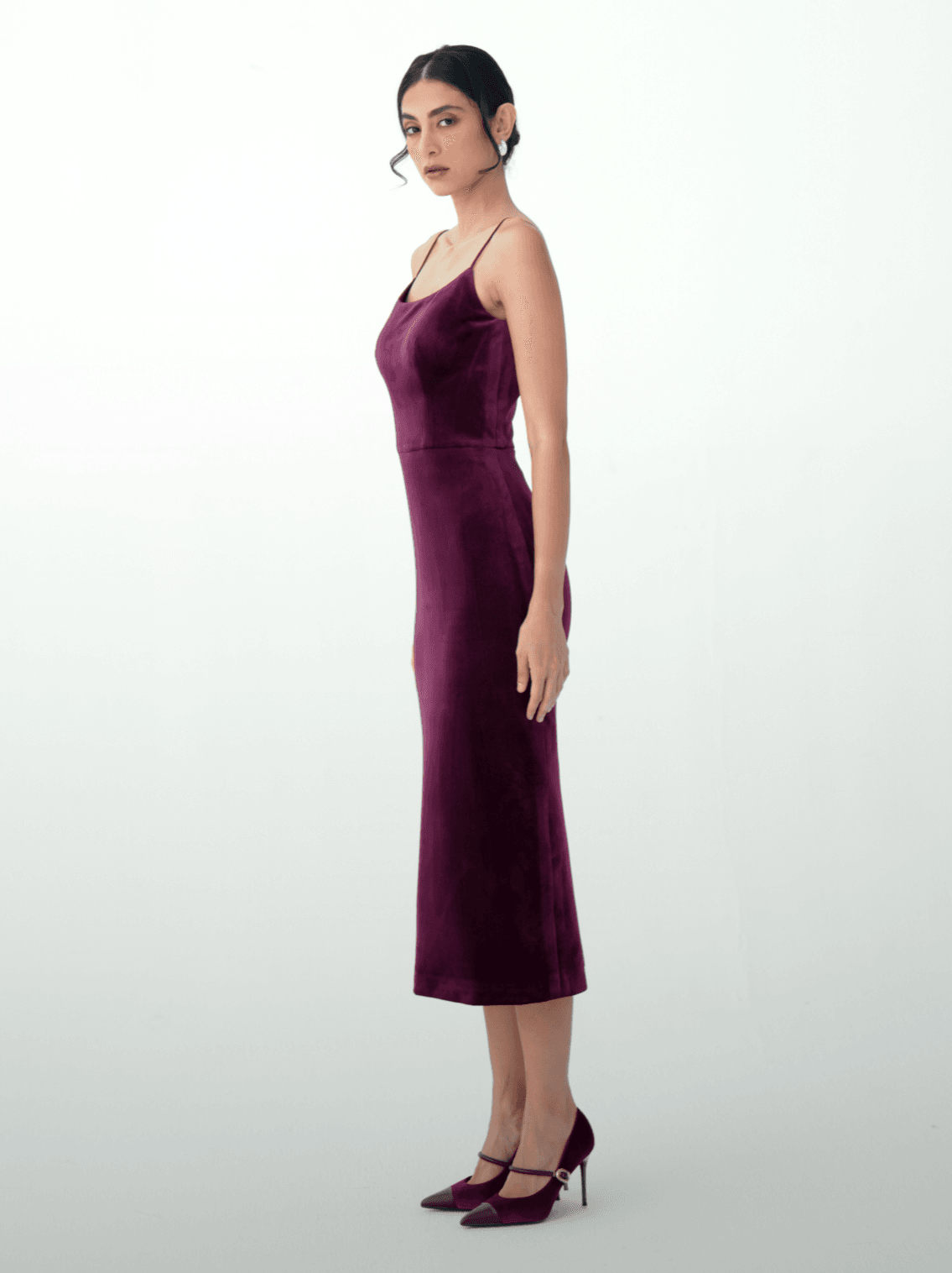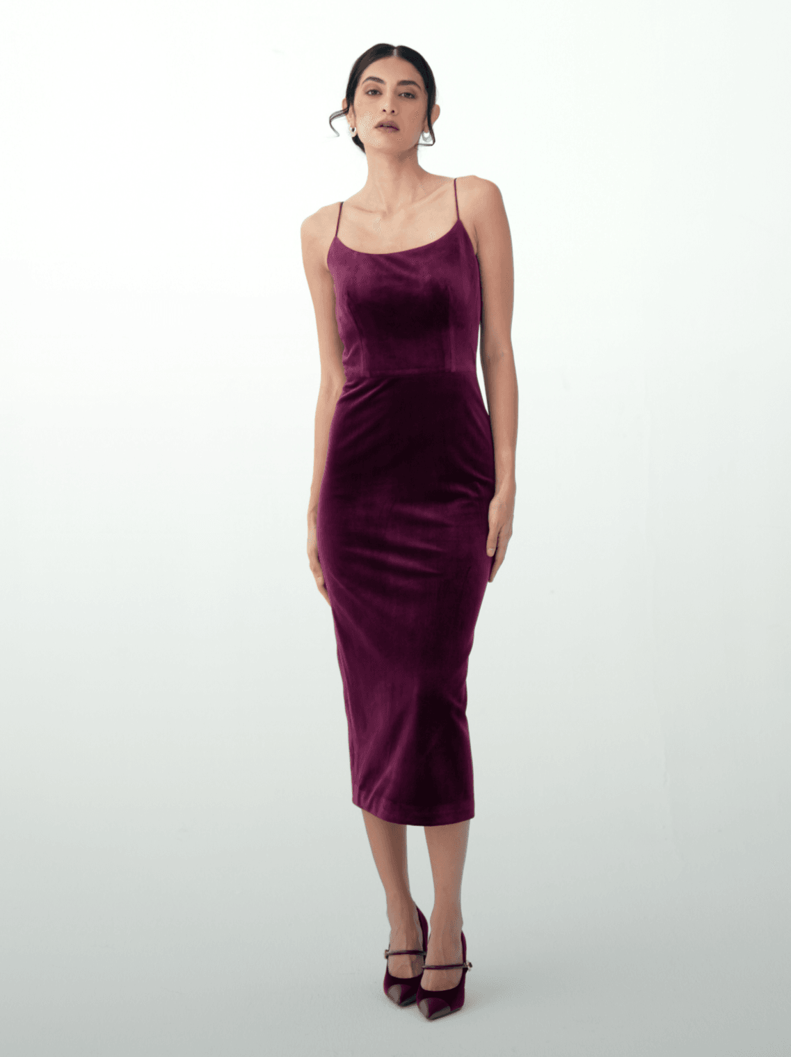 The Royal Wine Dress features a minimalist design with a sleek, fitted silhouette that gracefully accentuates your figure. The delicate spaghetti straps and scoop neckline offer a refined and feminine touch, while the dress’s midi length ensures a classic and versatile style. With its seamless construction, this dress embodies understated glamour, allowing you to stand out effortlessly.