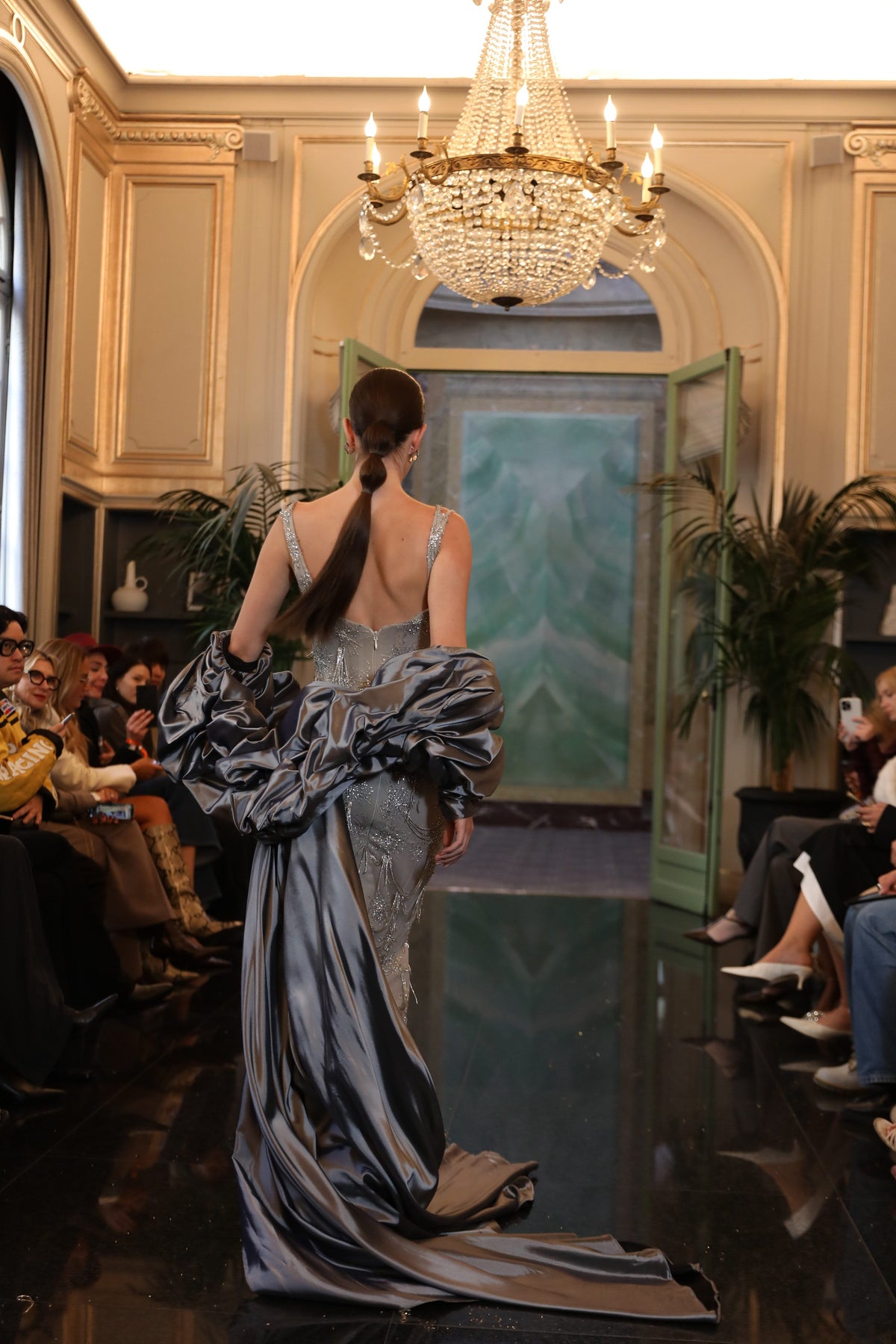 This glamorous silver gown is a masterpiece of couture craftsmanship, featuring handmade silver rhinestone embellishments intricately arranged to create a luminous, sculpted effect. The sleek silhouette is paired with a dramatic taffeta cape, adding volume and elegance to its striking design. Perfect for galas, red-carpet events, or elite evening affairs, this gown captures sophistication and allure in every detail.