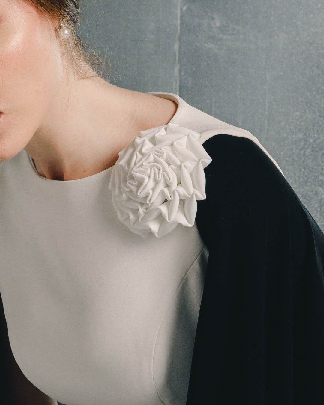 This Jumpsuit one piece features a sleek, ivory bodice that seamlessly transitions into an elegant, floor-length black sleeve cape. The fitted silhouette is designed to flatter, while the dramatic black drape adds a striking contrast, ensuring a grand entrance. A delicate, handcrafted floral embellishment rests on the shoulder, adding a touch of femininity to the structured design.