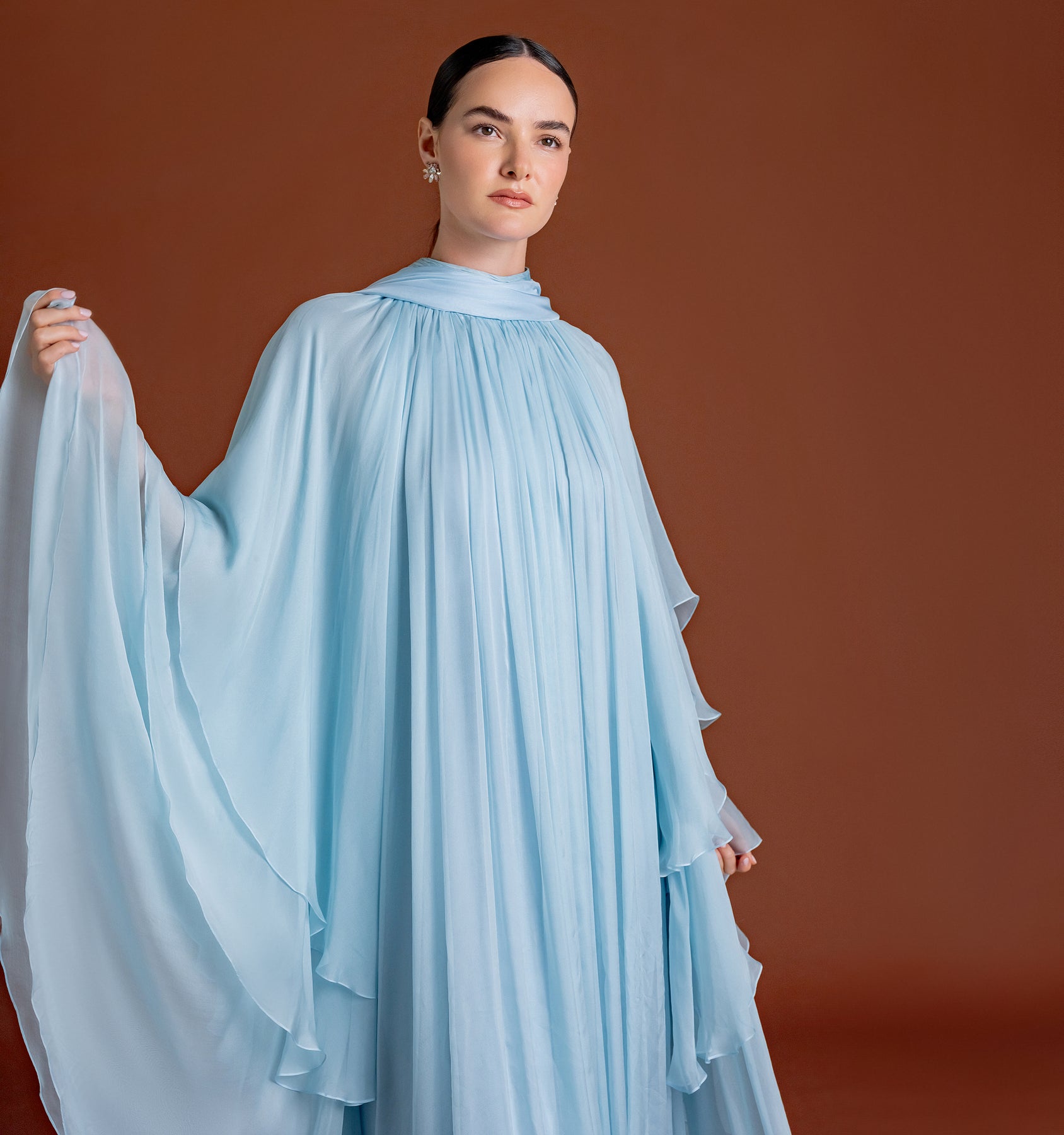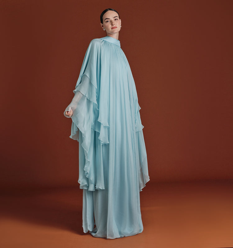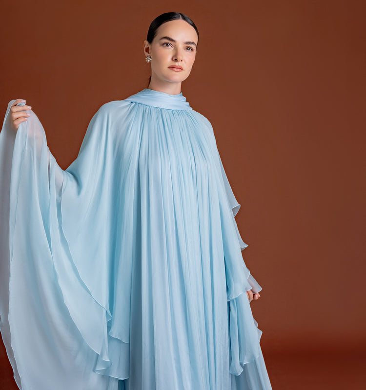 Embody celestial grace in this breathtaking floor-length gown, a masterpiece of movement and texture rendered in a serene sky blue. This piece features a sophisticated high neckline and a mesmerizing array of micro-pleated chiffon that cascades into dramatic, multi-layered wing-like sleeves. The voluminous, airy silhouette creates a stunning cape effect, offering a romantic and modest aesthetic that is perfect for high-end celebrations or gala events. To maintain the intricate pleating and the delicate nature of the premium silk-chiffon fabric, this garment is strictly dry clean only.