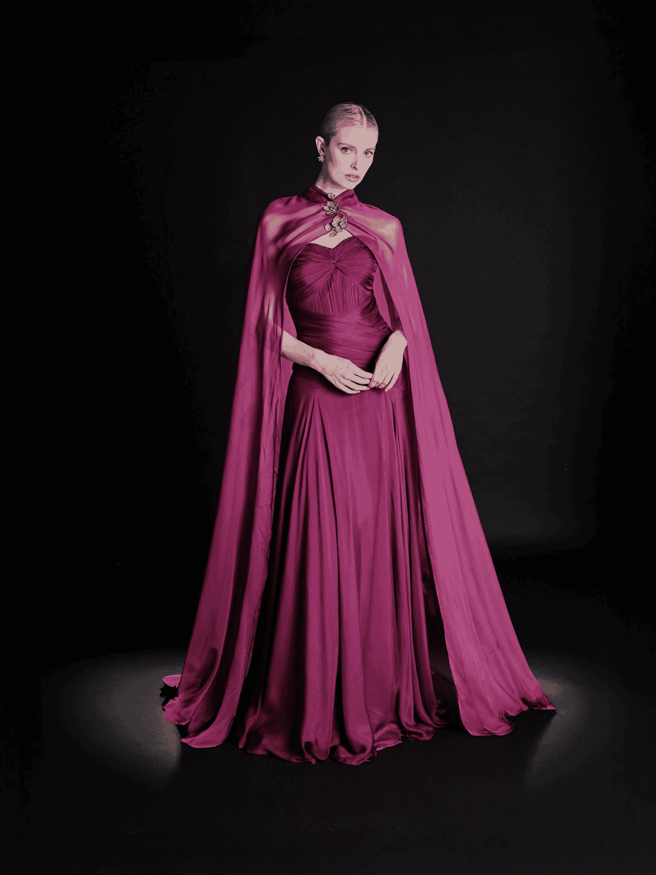 Indulge in sophistication with this Deep Fuchsia Strapless Gown, a true statement of luxury and elegance. Designed with a beautifully ruched bodice, a flowing silhouette, and a sheer cape adorned with intricate embellishments, this gown embodies timeless charm. The rich deep fuchsia hue enhances its regal appeal, making it a stunning choice for formal occasions, evening galas, and red-carpet moments.