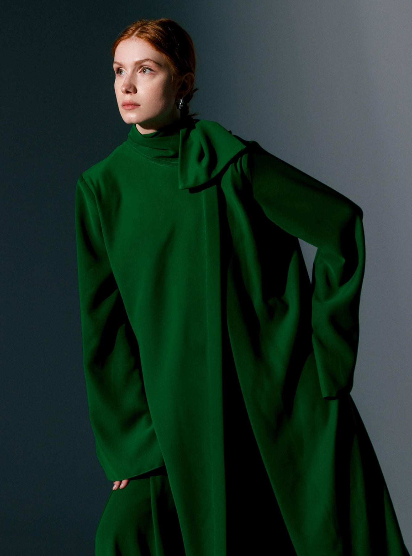 Crafted from high-quality silk, this gown features a flowing silhouette that drapes beautifully over the body, creating a graceful and feminine look. The delicate crepe texture adds a touch of sophistication to the design, making it a standout piece in any setting.