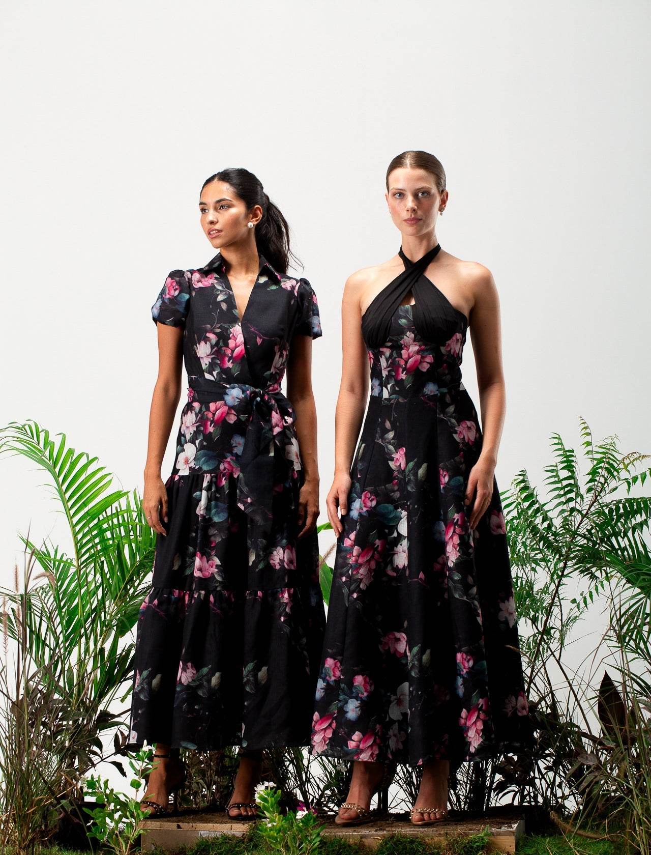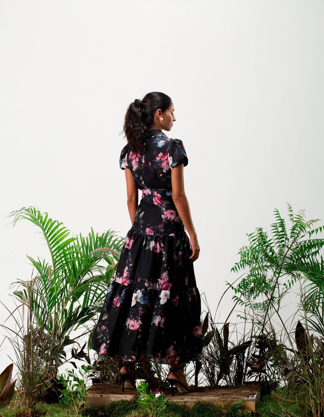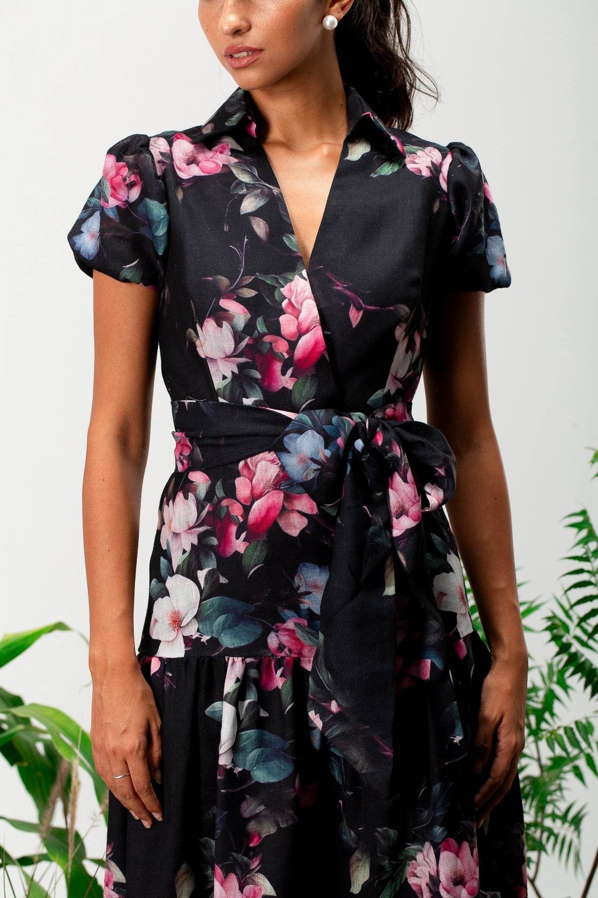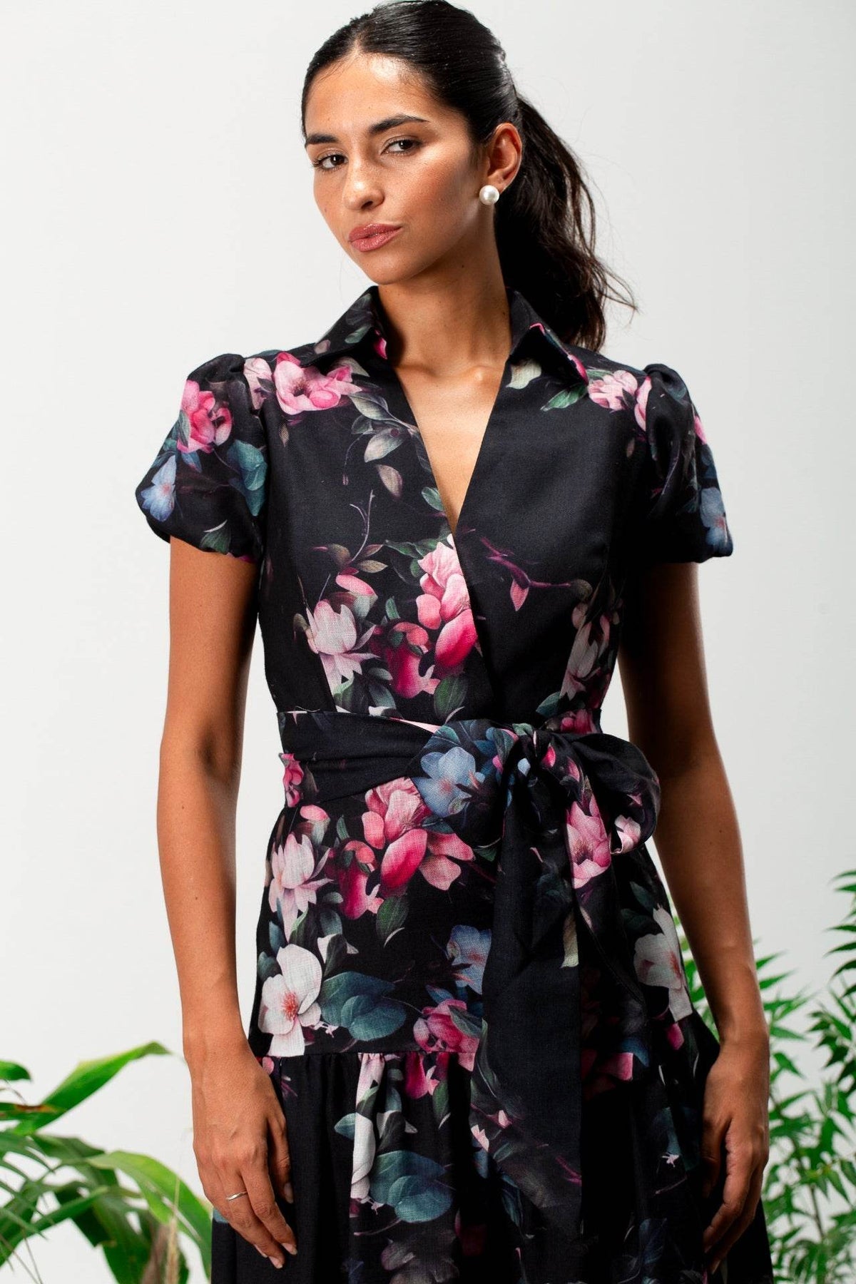 Introducing the Moonmains floral wrap dress, a perfect blend of elegance and modern flair. This beautiful dress is crafted from luxurious black chiffon, composed of 100% polyester, providing a lightweight and airy feel. The design features a collared neckline, short puff sleeves, and a flattering wrap front with a self-tie belt, cascading into a tiered maxi skirt adorned with vibrant floral prints.