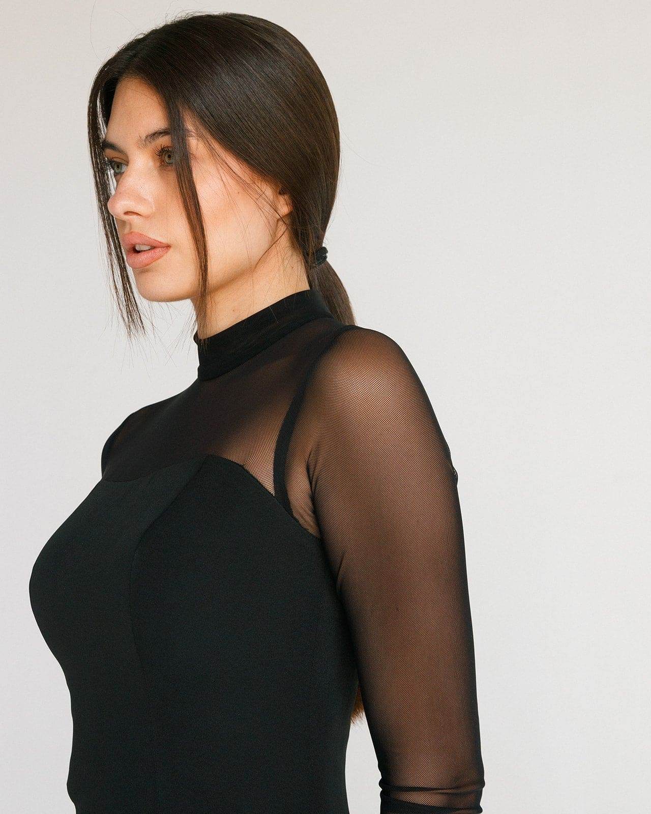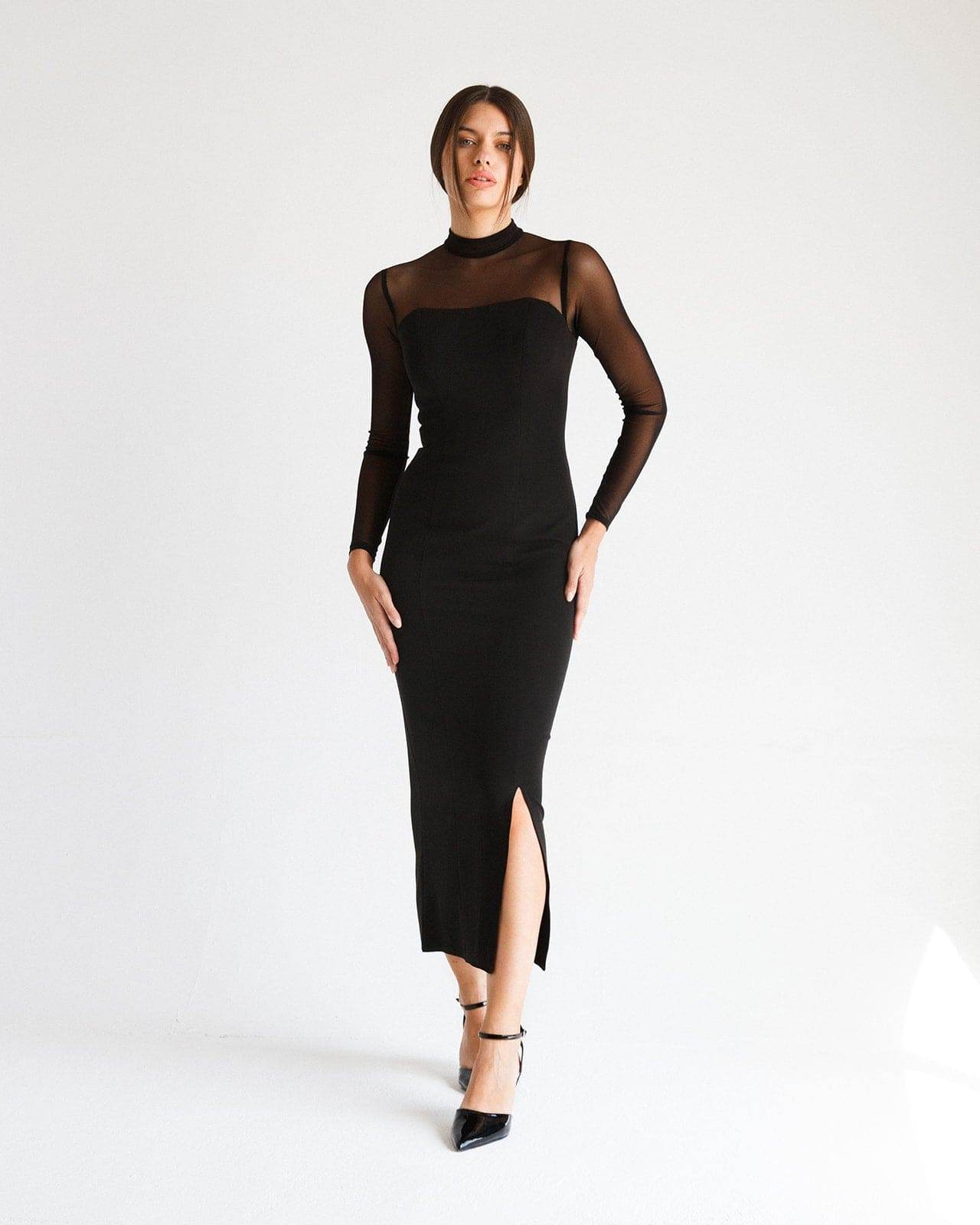 The upper part of the dress is accentuated with a delicate tulle overlay, extending from the high neck down to the wrist, adding a touch of mystique and allure. The transparency of the tulle contrasts beautifully with the opaque black dress beneath, giving a layered appearance that's both chic and captivating. The fitted bodice transitions smoothly to a more relaxed midi-length skirt, with a daring slit that adds a hint of edginess to the overall demure design.