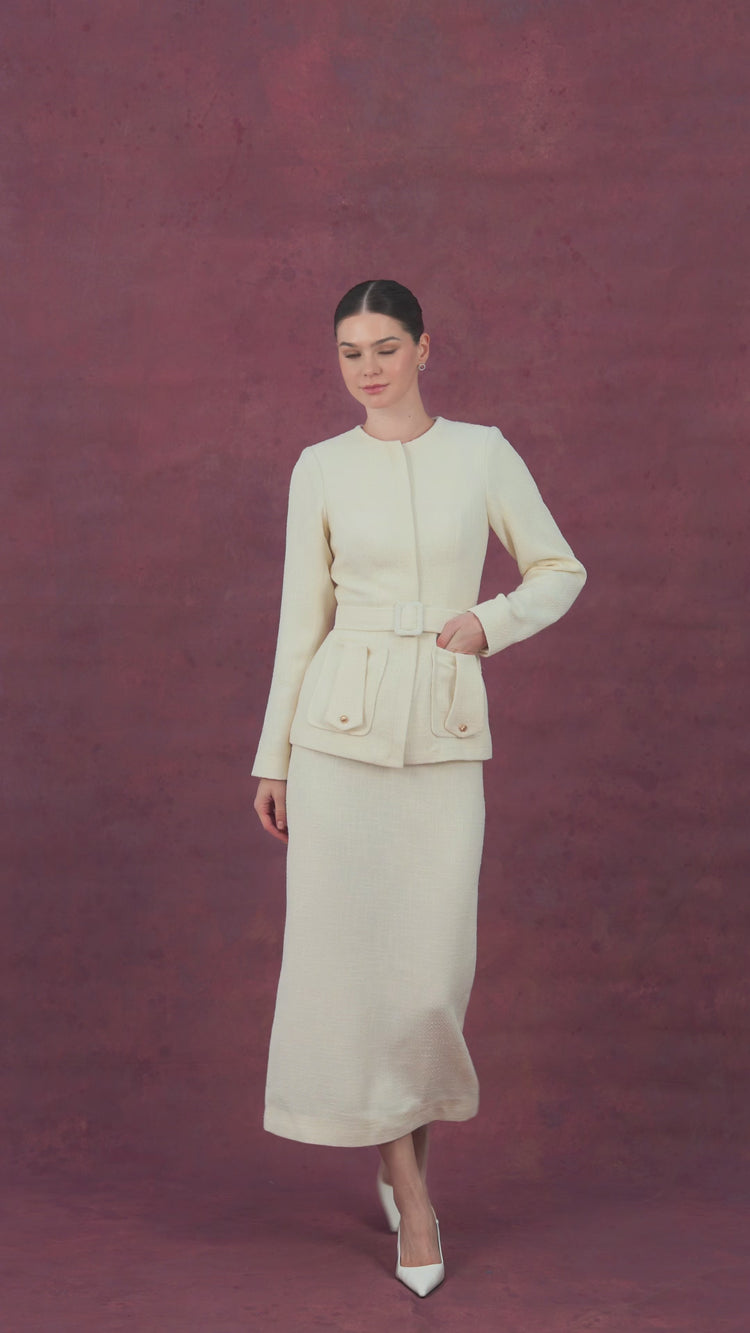 This timeless cream ensemble features a textured belted jacket paired with a matching midi skirt. The jacket showcases a structured design with a round neckline, front zipper closure, and functional flap pockets for added elegance. The coordinating skirt is tailored to perfection, offering a sleek and polished look suitable for formal occasions or chic daywear. This set is the epitome of sophistication and versatility.