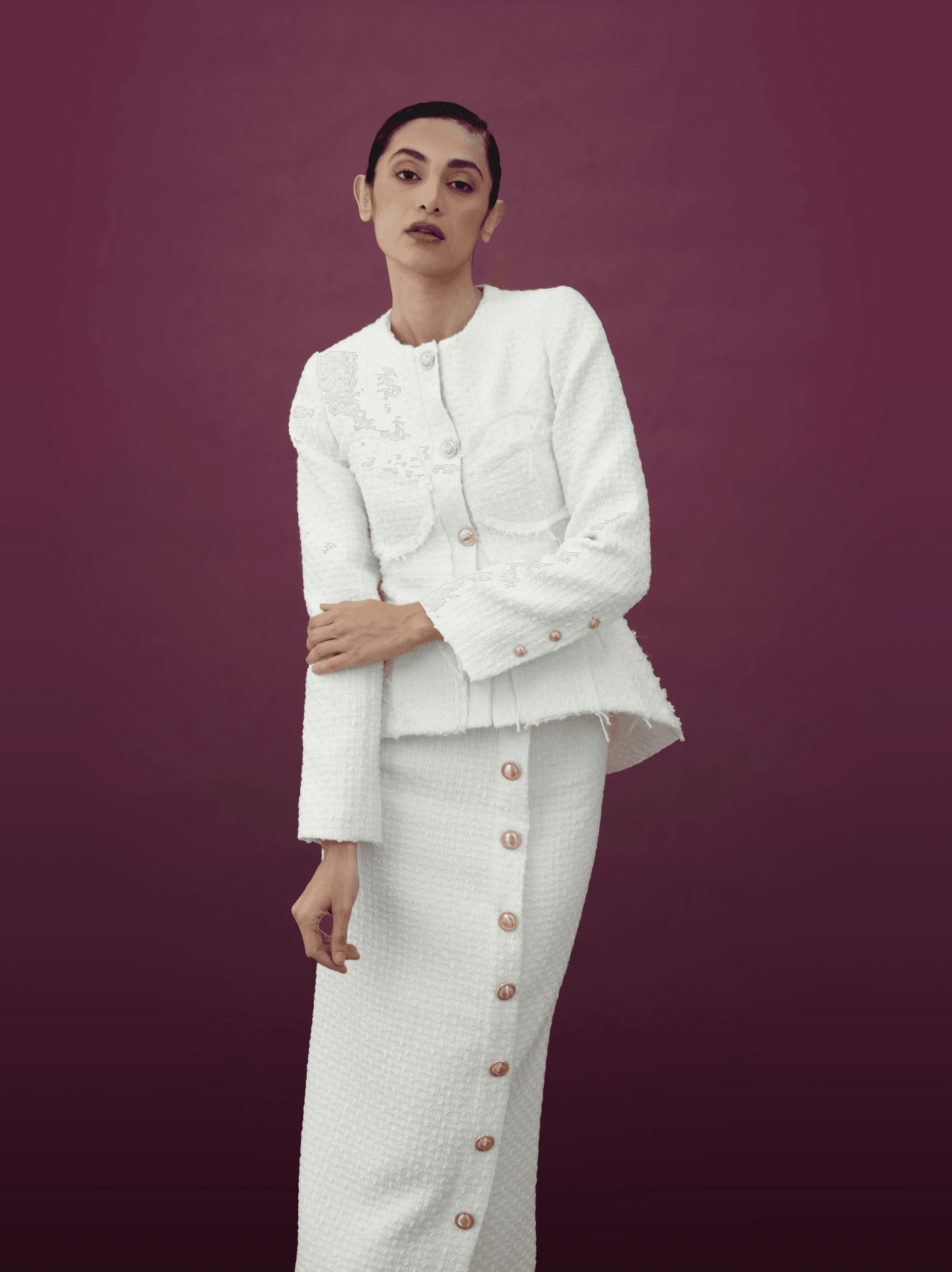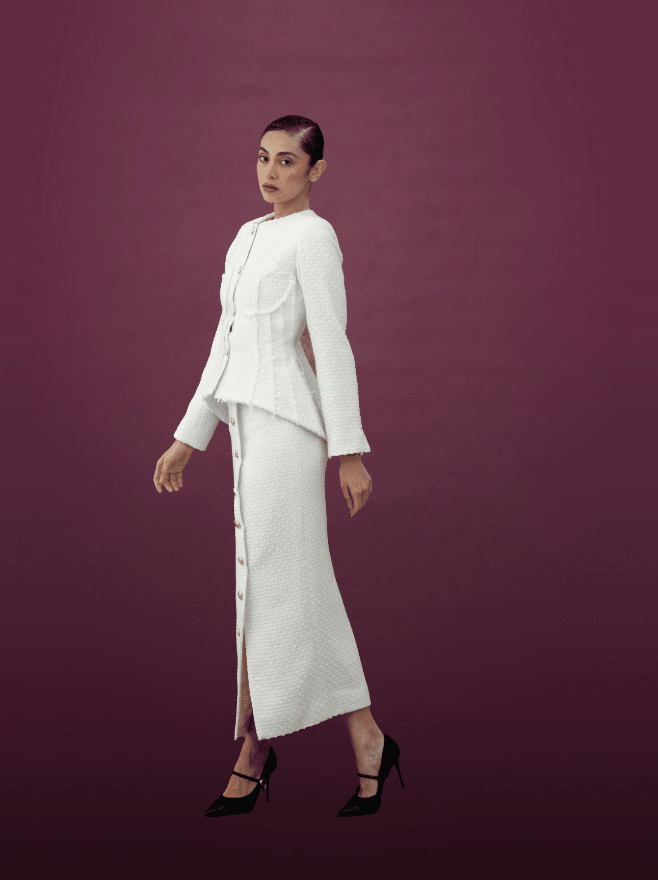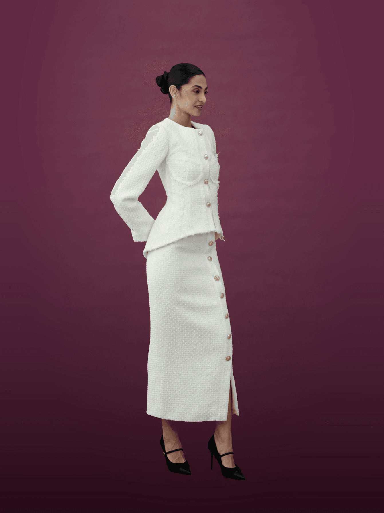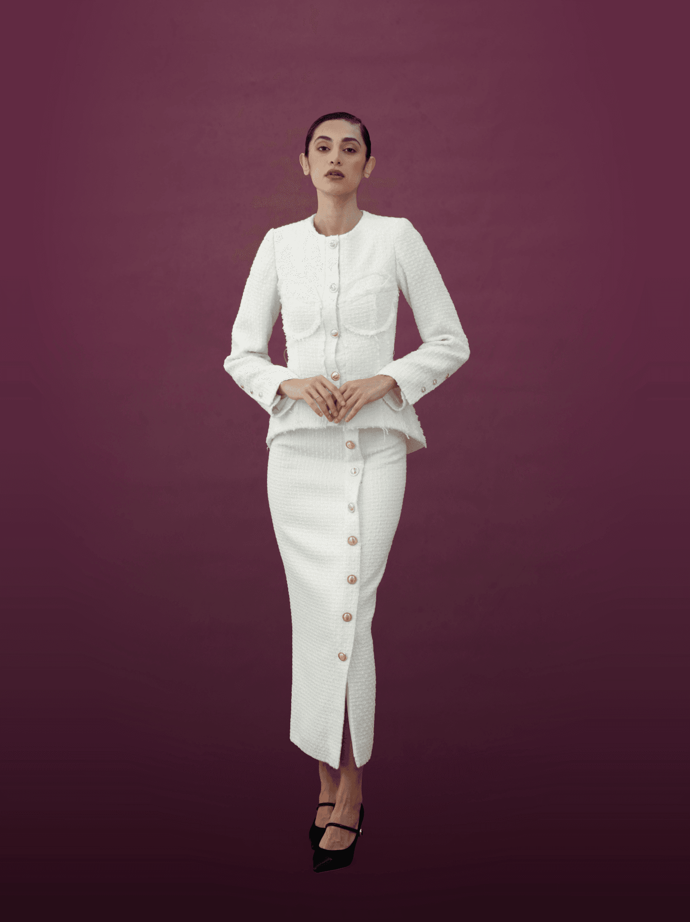 The fitted midi skirt is designed with a front button detail and a subtle slit, balancing grace with modern allure. Together, the ensemble creates a harmonious silhouette that celebrates femininity while offering effortless sophistication.