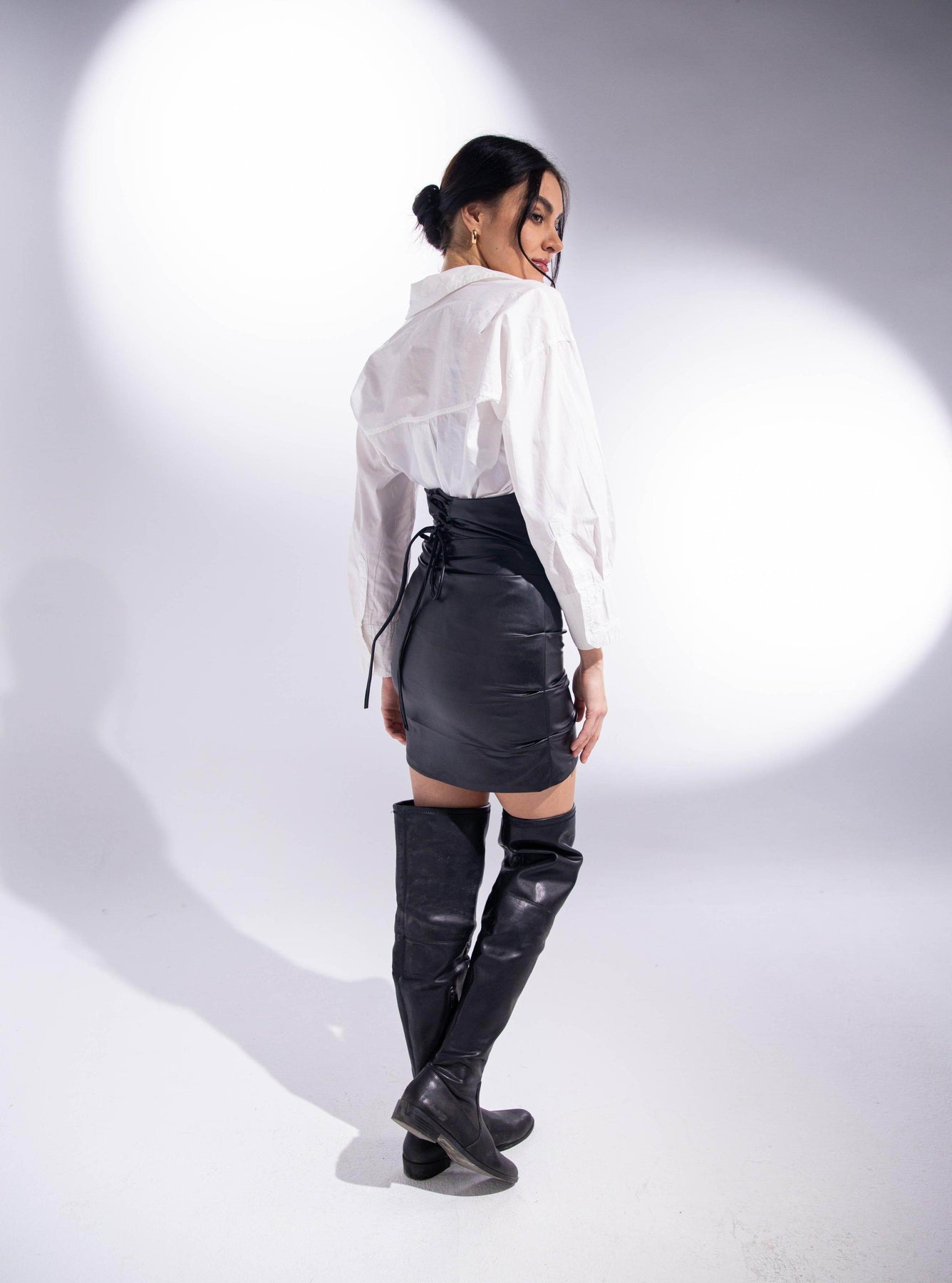 RUCHED HIGH WAIST FAUX LEATHER MINI SKIRT WITH TIE