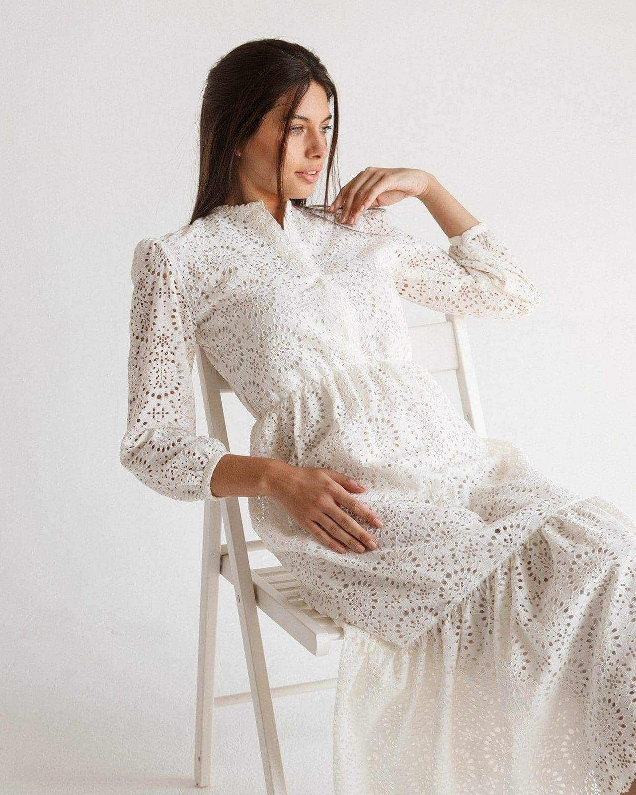 To maintain the dress's delicate embroidery and pristine white hue, it is recommended to hand wash in cold water using a mild detergent. Lay flat to dry away from direct sunlight. Refrain from using bleach or harsh chemicals. If needed, iron on a low setting, placing a cloth between the iron and the dress to protect the embroidery.